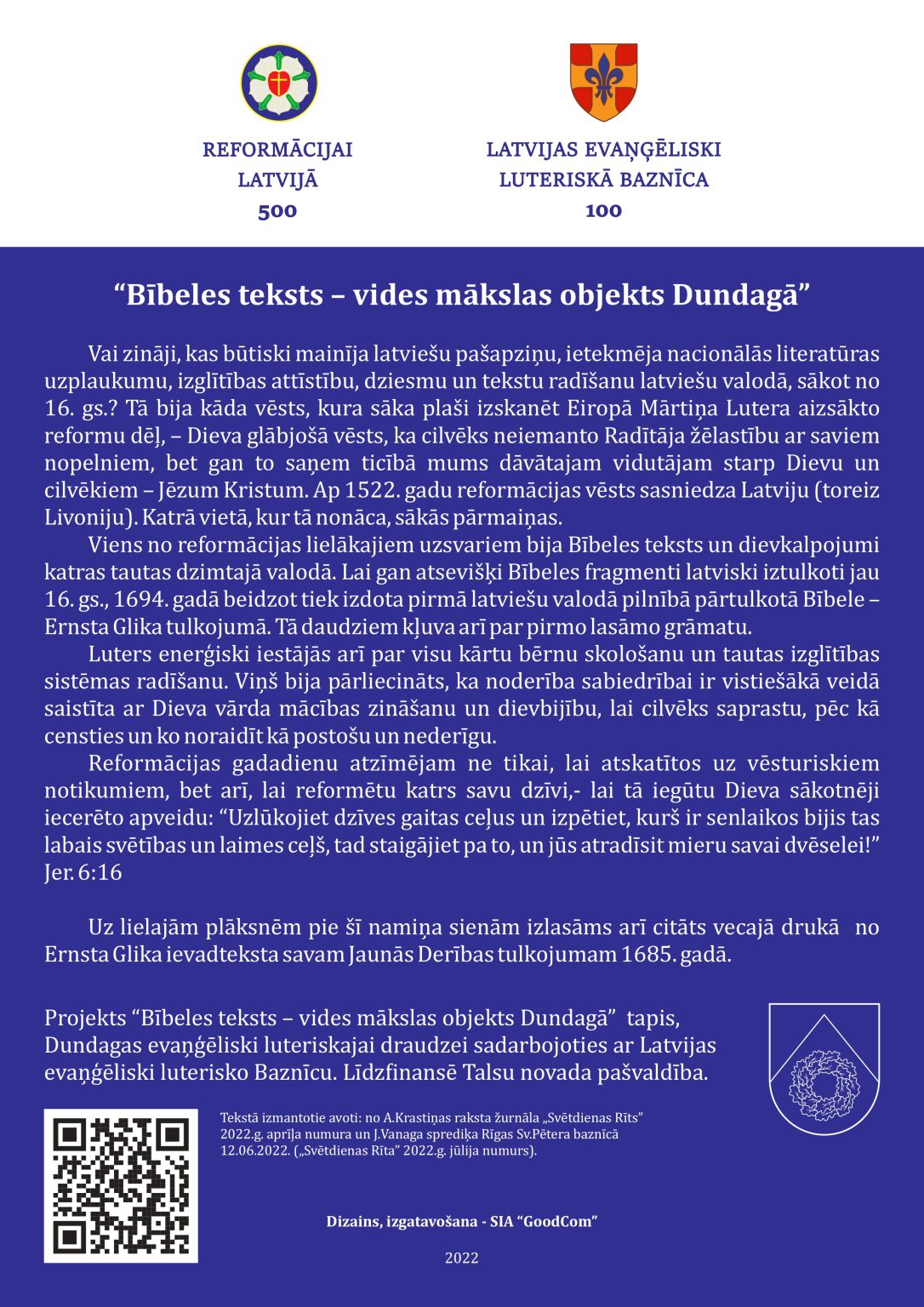 Pateicoties Dundagas evaņģēliski luteriskās draudzes aktivitātēm, kas šajā gadā jo īpaši saistītas ar reformācijas 500 gadadienas, kā arī Latvijas evaņģēliski luteriskās Baznīcas (LELB) 100 gadadienas atzīmēšanu, Talsu novads un Dundaga ir kļuvusi bagātāka ar vēl vienu unikālu vides mākslas objektu – Bībeles tekstu citātiem uz īpaši dizainētām plāksnēm.
